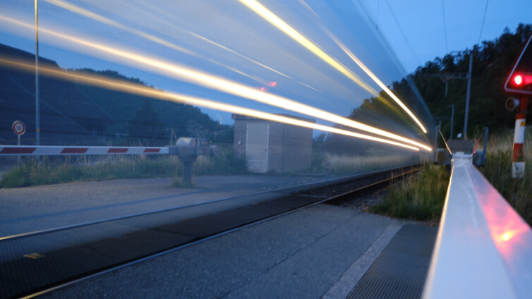 Ungeplant stehe ich an der Bahnschranke, es blaue Stunde und der Zug naht.